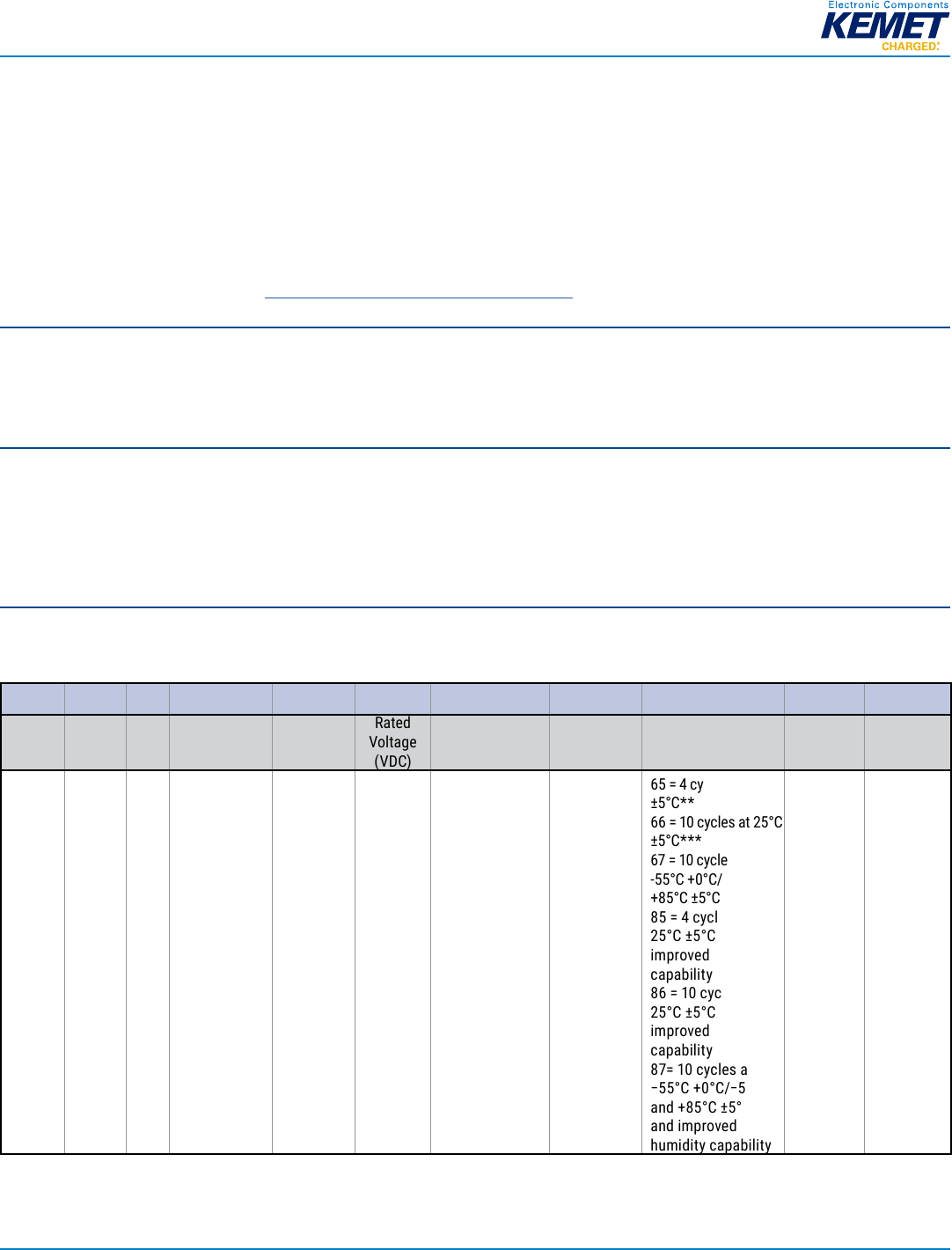 (1) To complete KEMET part number, insert 65 = 4 cycles +25°C, 66 = 10 cycles +25°C, 67 = 10 cycles −55°C and +85°C, Designates surge current option.