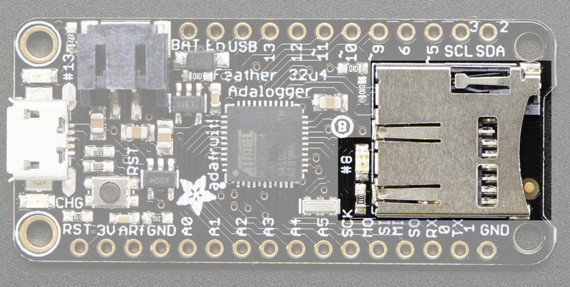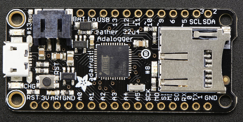 This is the Adafruit Feather 32u4 Adalogger - our take on an 'all-in-one' datalogger (or data-reader) with built in USB and battery charging. Its an Adafruit Feather 32u4 with a microSD holder ready to rock!