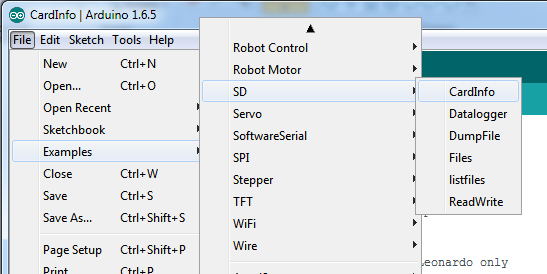 Luckily many of the default examples already have chipSelect = 4 so you can just upload immediately. For other sketches, do check to make sure that CS is set to 4! The SD card uses hardware SPI for the remaining pins.