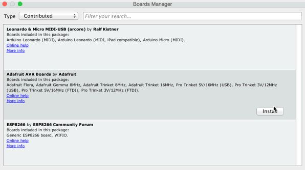 Once the Board Manager opens, click on the category drop down menu on the top left hand side of the window and select Contributed. You will then be able to select and install the boards supplied by the URLs added to the prefrences. In the example below, we are installing support for Adafruit AVR Boards, but the same applies to all boards installed with the Board Manager.