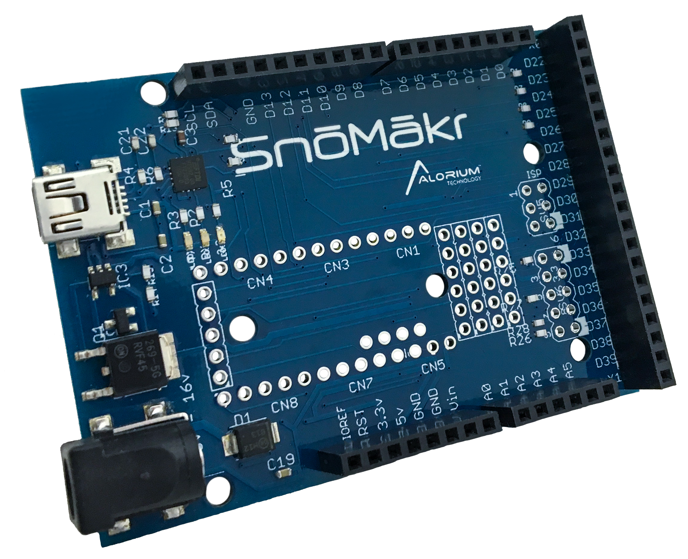Alorium's SnōMākr breakout board works in conjunction with Snō FPGA module to provide efficient prototyping through access to signal I/O in the familiar Arduino Uno layout. This board is compatible with 3.3 V Arduino shields, and designers can still access the additional 18 Snō digital signal pins when a shield is being used. SnōMākr features an onboard FTDI driver and voltage regulators allowing connectivity with existing Mini-USB cables and power adapters.
