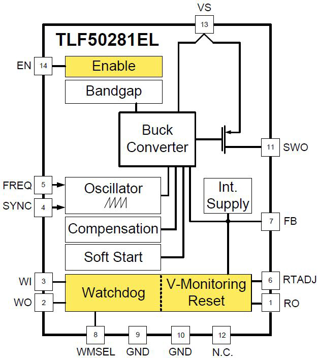 Infineon's TLF502x1-family are asynchronous DC / DCs with integrated power transistors providing 500 mA output current at 5 V (±2%). TLF502x1 can be operated with up to 100% duty-cycle with an input voltage range from 4.75 V up to 45 V. At low loads, the ultra-low current consumption of less than 45 μA is achieved by a change from PWM- to PFM-mode. The adjustable switching frequency of up to 2.2 MHz can be synchronized to an external clock. This high-switching frequency allows the use of small and cost-effective inductors and capacitors, resulting in a low, predictable output voltage ripple and in minimized consumption of board space. The integrated compensation and soft-start function allows easy implementation and reduction of external components as well. The TLF502x1-family is covering features required in automotive applications like enable, reset with adjustable threshold, and watchdog with adjustable timing. The family pin-out enables flexibility and reduction of design efforts. The devices include protection features such as a cycle-by-cycle current limitation, over-temperature shutdown, and input under-voltage lockout. The TLF502x1-family is coming in a small, thermal enhanced SSOP-14 exposed-pad package (RoHS).