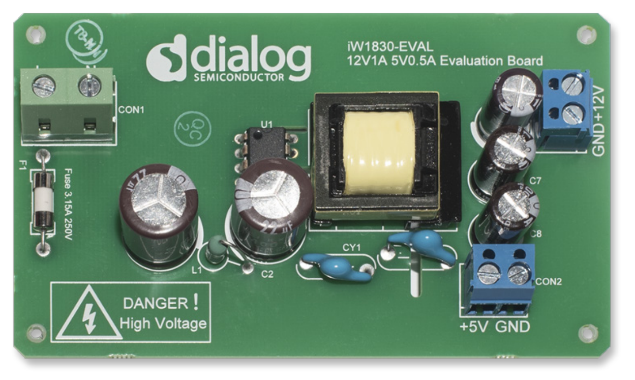 The iW1830-EVAL evaluation board implements a dual-output, 15W power supply based on Dialog Semiconductor’s iW1830 AccuSwitch™ digital offline power supply controller IC. The evaluation board supplies two outputs, 12V/1A and 5V/0.5A, using a single primary-side controlled quasi-resonant flyback converter. The design implements two output voltages using one primary-side controller and achieves the tight regulation required by high-reliability applications such as white goods, home appliances and industrial control.