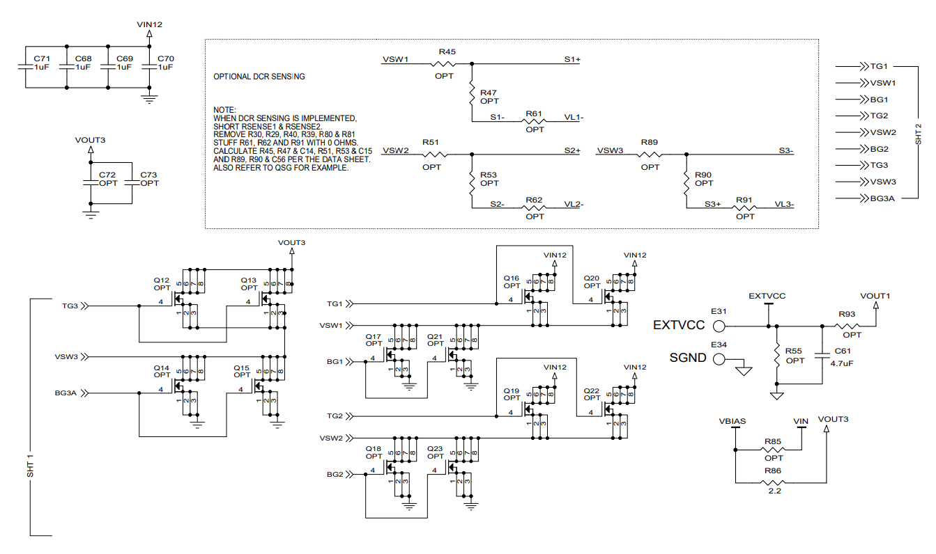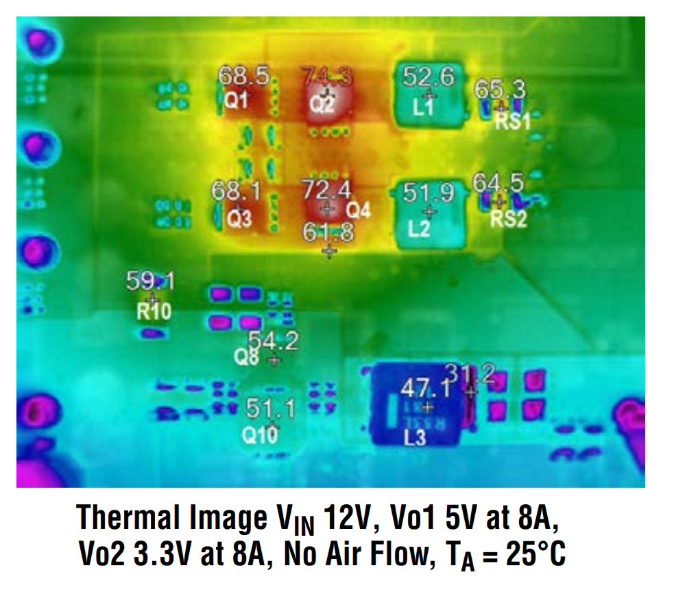 DC2738A is a triple output synchronous step-up/dual step-down supply featuring the LTC7815. The demonstration circuit is designed for two buck circuits VOUT1 5V @ 8A and VOUT2 3.3V @ 8A outputs supplied by a boost circuit VOUT3 10V @ 7A output. (If VIN is higher than 10V then VOUT3 equals to VIN.) Benefiting from this feature, the buck outputs are able to maintain regulation over a wide input voltage range of 4.5V to 36V which is suitable for automotive or other battery fed applications. Also, the demonstration circuit uses a drop-in layout that the main buck circuit components fit in an area of three-quarter inches by 1.5 inches, while the main boost circuit area is three-quarter inches by 1.75 inches.