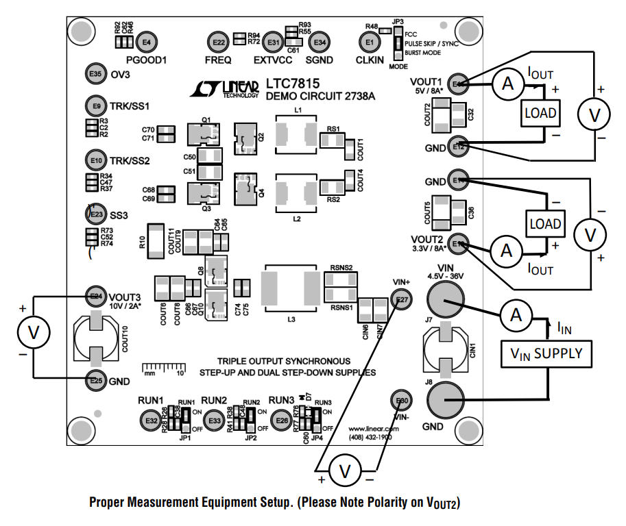 The main features of the board include rail tracking (buck channels only), an internal 5V linear regulator for bias, separated RUN pins for each output, a PGOOD signal (CH1 only), an over voltage indicator for CH3 and a mode selector that allow the converter to run in CCM, pulse-skipping or Burst Mode® operation. Synchronization to an external clock is also possible. The LT7815 data sheet gives a complete description of these parts, operation and application information. The data sheet must be read in conjunction with this quick start guide for demo circuit 2738A.