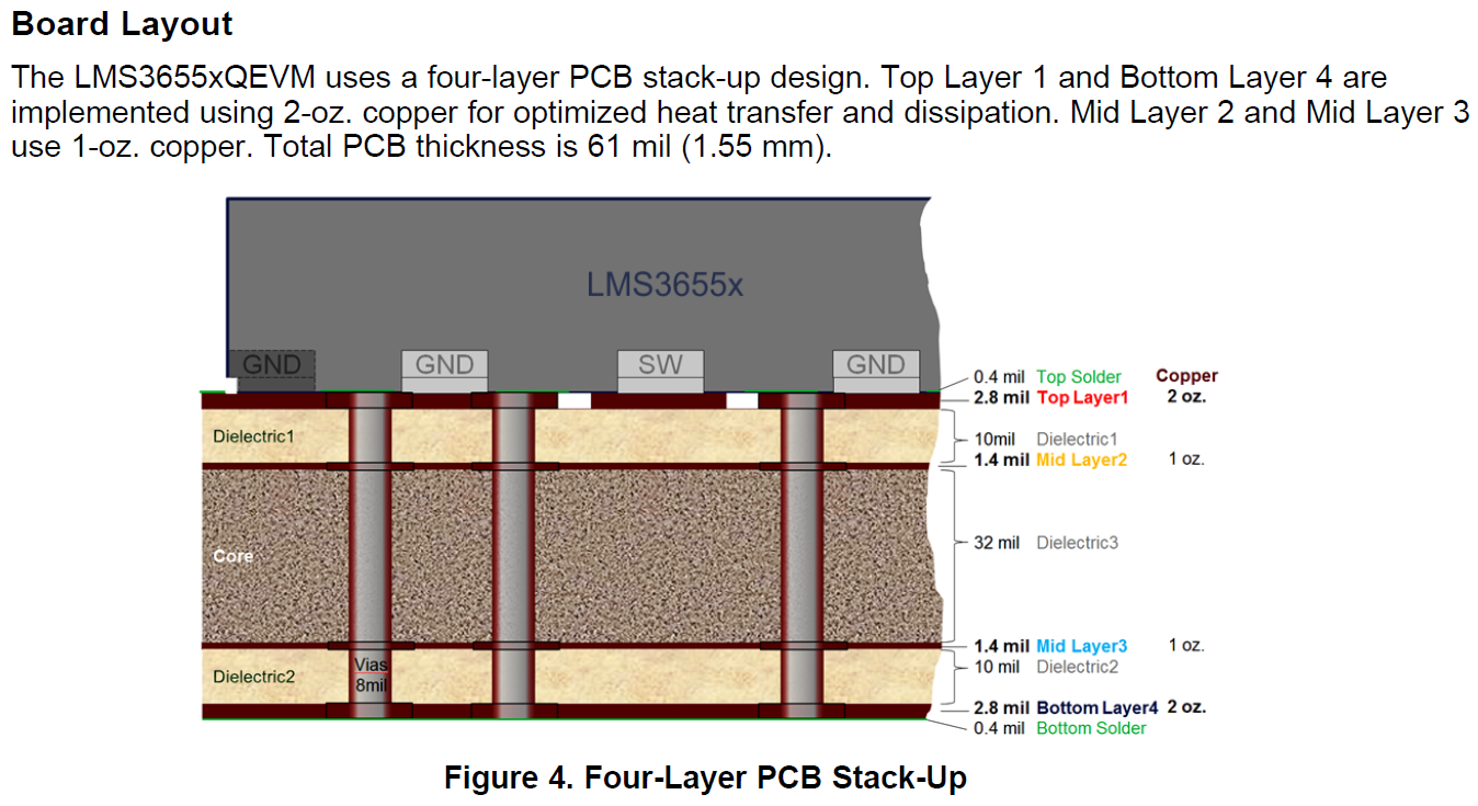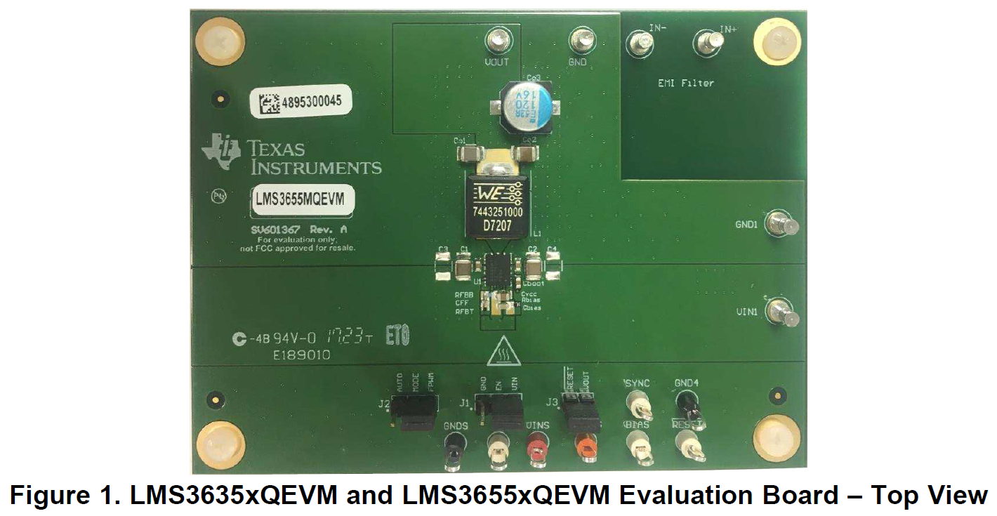 The LMS3655xQEVM is specifically designed for automotive and high-performance industrial applications, providing an output voltage of 5 V, 3.3 V, or an adjustable output at a continuous load of 5.5-A. The LMS3635xQEVM is implemented using the same PCB board and components, but the IC current limit is set for a maximum continuous load of 3.5-A. The LMS3655xQEVM can be used to evaluate both the LMS3655-Q1 IC and the LMS3655 IC.