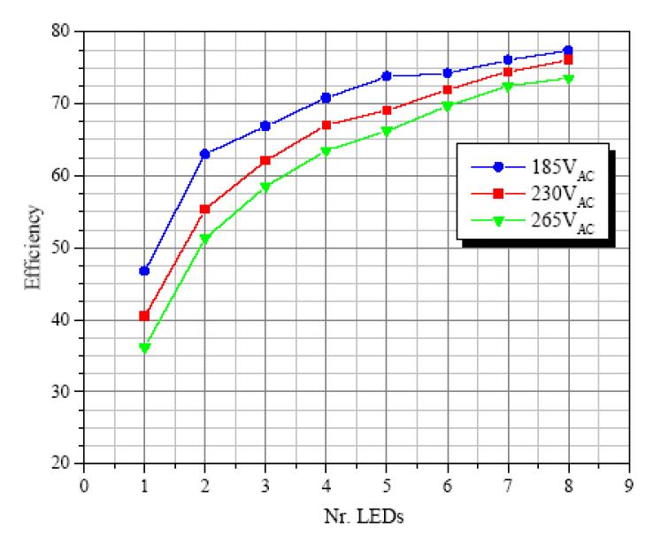 The power supply is capable of driving a 1 to 8 LED array in the European voltage range of 185-265 VAC without modifications. The same VIPer device can also function within the specifications in the U.S. input voltage range by using an input voltage doubler.