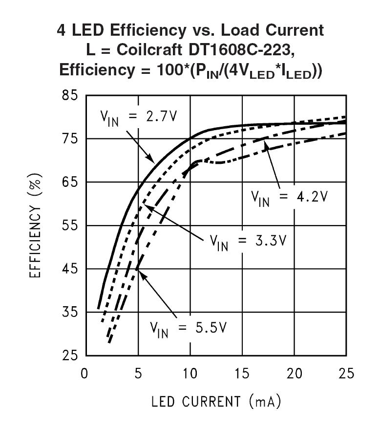 >78%, 2.7V in, 3 LEDs @ 20 mA >74%, 5.5V in, 4 LEDs @ 20 mA >74%, 5.5V in, 3 LEDs @ 20 mA |