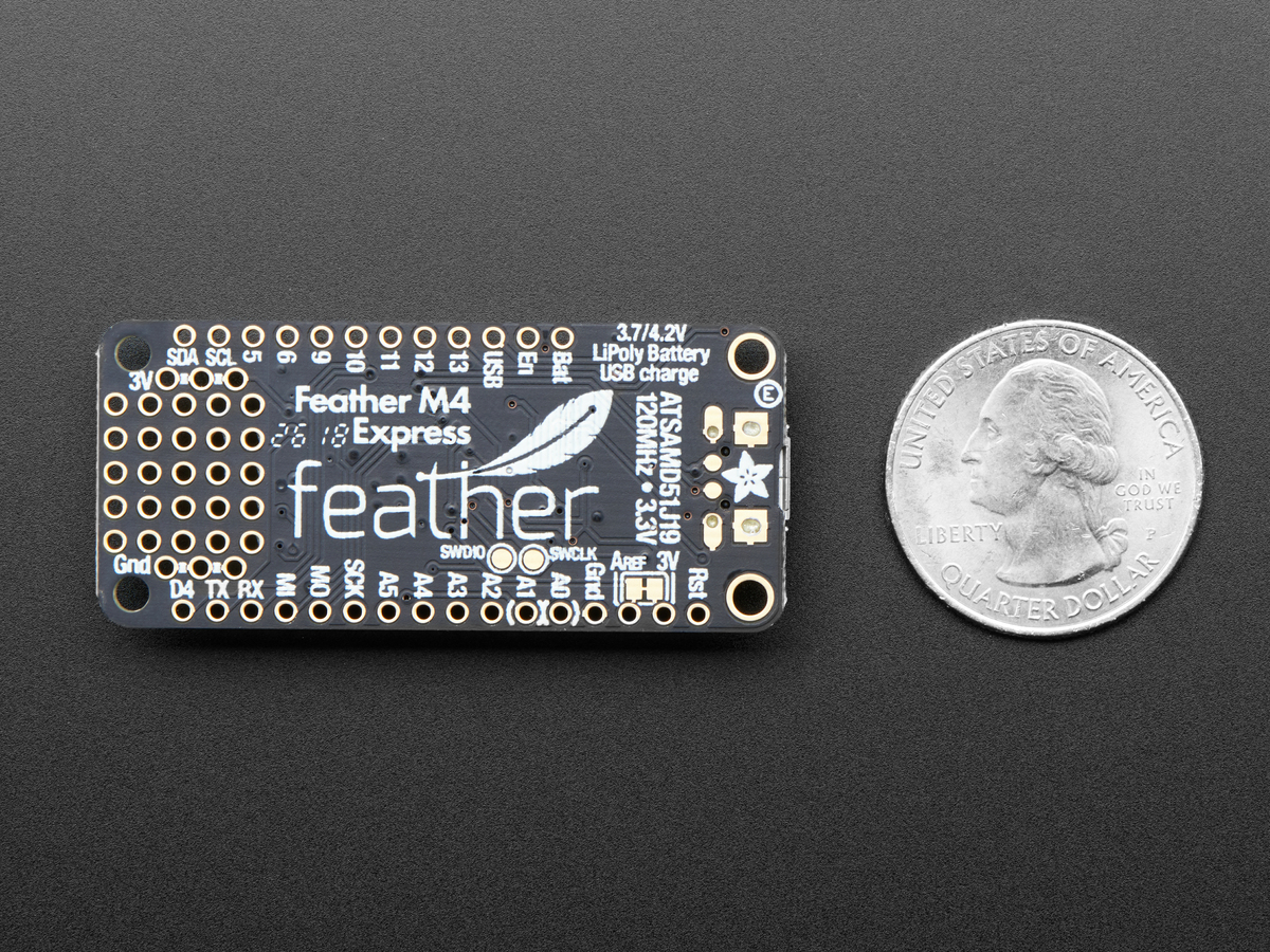 It's what you've been waiting for, the Feather M4 Express featuring ATSAMD51. This Feather is fast like a swift, smart like an owl, strong like a ox-bird (it's half ox, half bird, OK?) This feather is powered by our new favorite chip, the ATSAMD51J19 - with its 120MHz Cortex M4 with floating point support and 512KB Flash and 192KB RAM. Your code will zig and zag and zoom, and with a bunch of extra peripherals for support, this will for sure be your favorite new chipset.